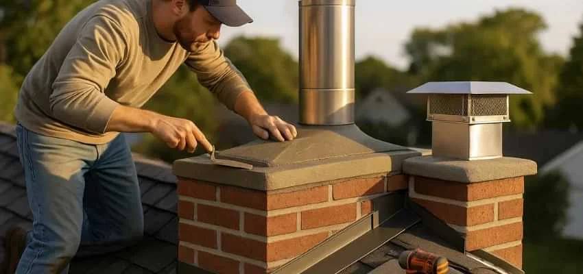 A proper crown protects the top courses. We form a reinforced, sloped crown with a drip edge and an expansion gap around the flue tile, preventing saturation and freeze damage in Eagle Downs, DeSoto.