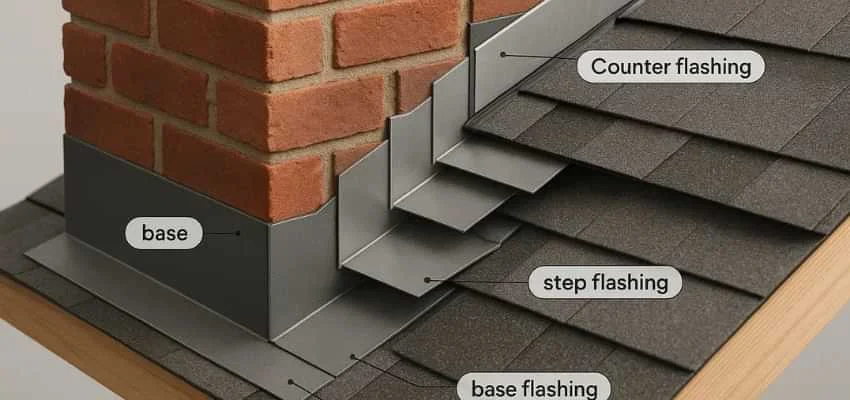 Step flashing tucks under each shingle course along the chimney sides. Counterflashing locks into mortar joints and overlaps those steps. In Trees Farm, DeSoto the overlap must be precise to block wind-driven rain. We avoid shortcuts like exposed face-nailing that can loosen and leak later.
